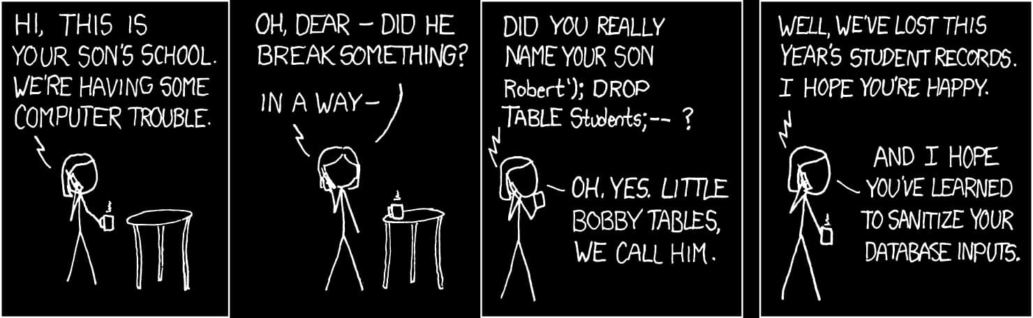 It is the same pattern behind SQL injection. The classic SQL injection example is XKCD's "Little Bobby Tables”.