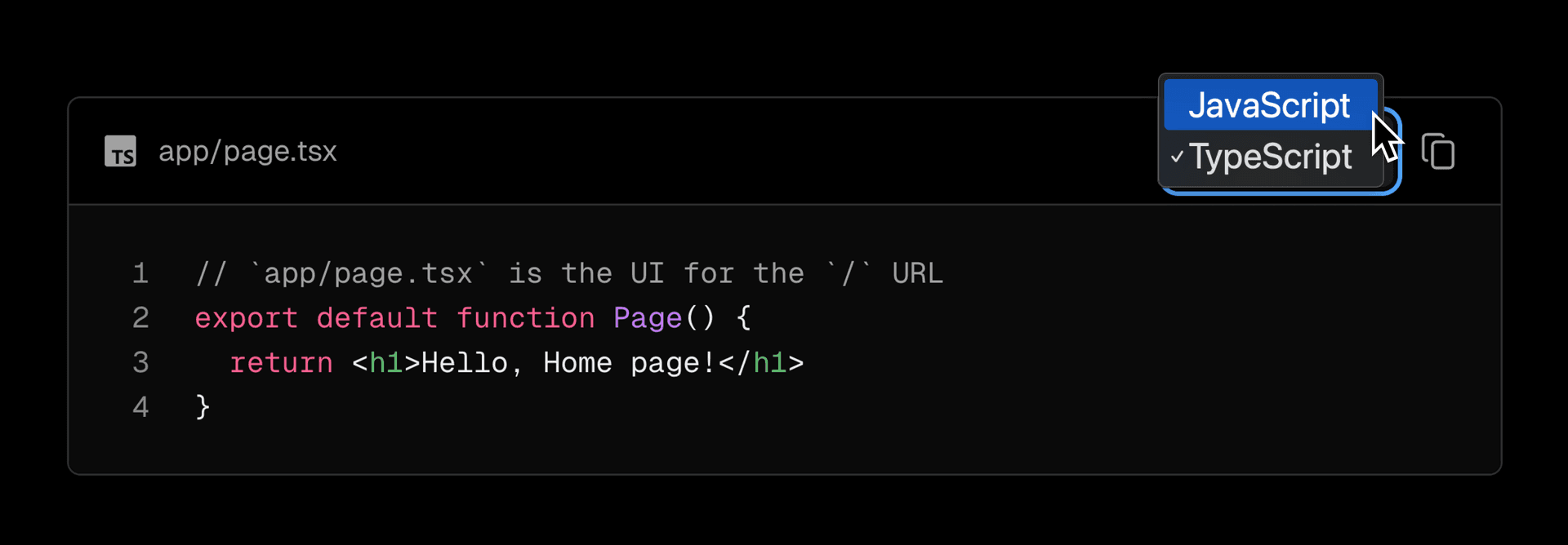 export function LanguagePicker({ setLanguage }) { return ( <select onChange={async (e) => { await interactionResponse(); setLanguage(e.target.value); }}> <option value="JS">JavaScript</option> <option value="TS">TypeScript</option> </select> );}Link to headingThe implementation