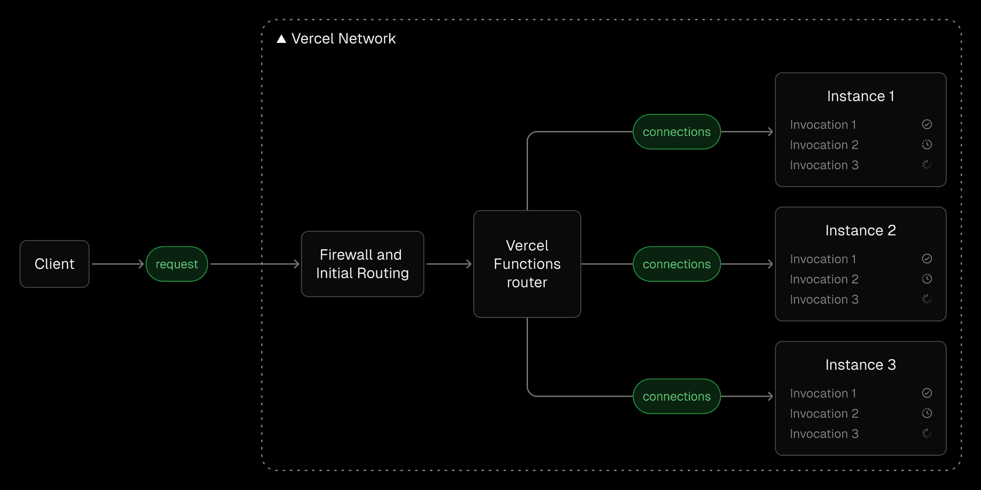 To address these inefficiencies, Fluid compute dynamically adjusts to traffic demands, reusing existing resources before provisioning new ones. At the center of Fluid is Vercel Functions router, which orchestrates function execution to minimize cold starts, maximize concurrency, and optimize resource usage. It dynamically routes invocations to pre-warmed or active instances, ensuring low-latency execution.