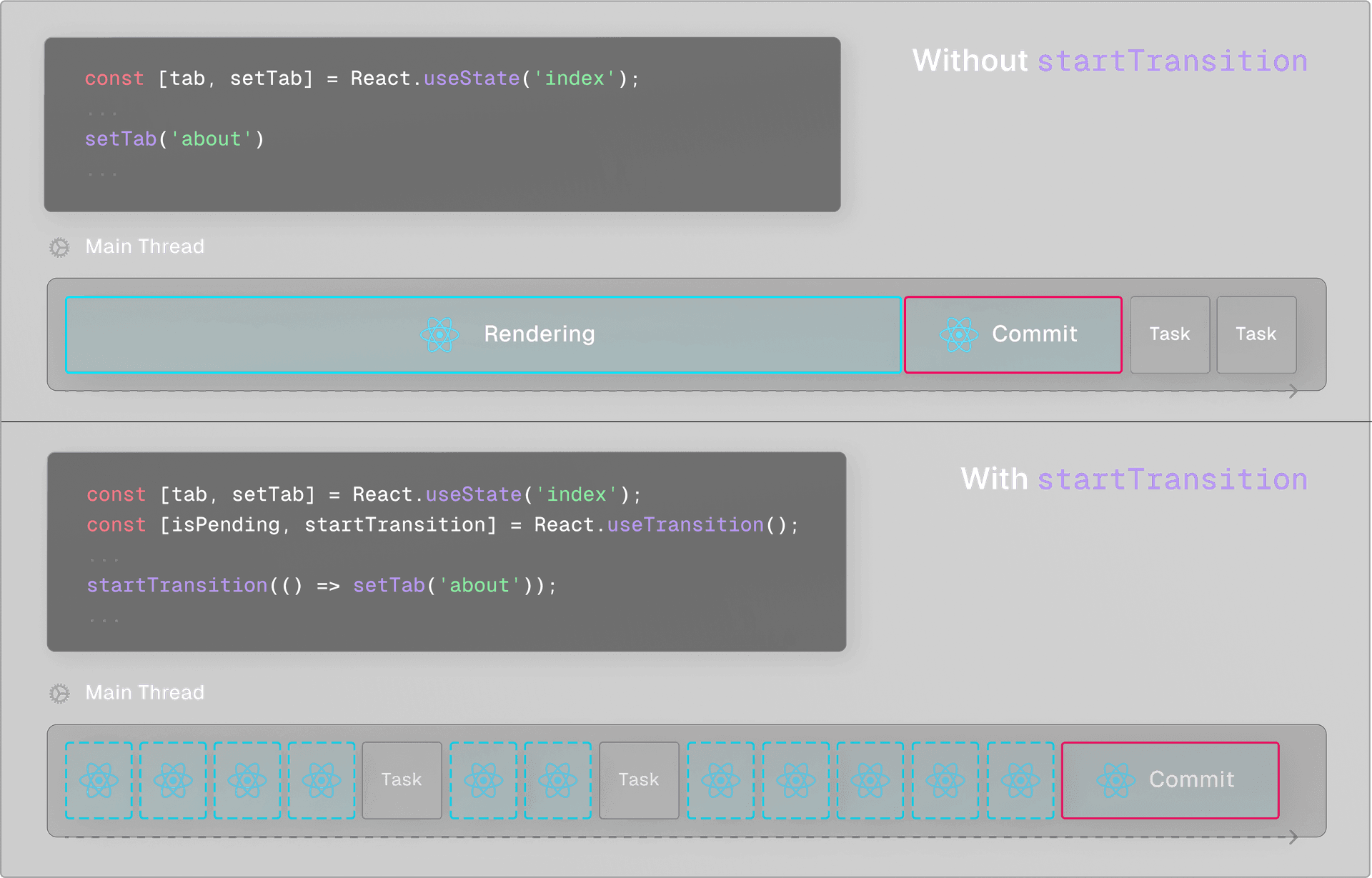 By wrapping a state update in startTransition, we can tell React that we’re okay with deferring or interrupting the rendering to prioritize more important tasks to keep the current user interface interactive.