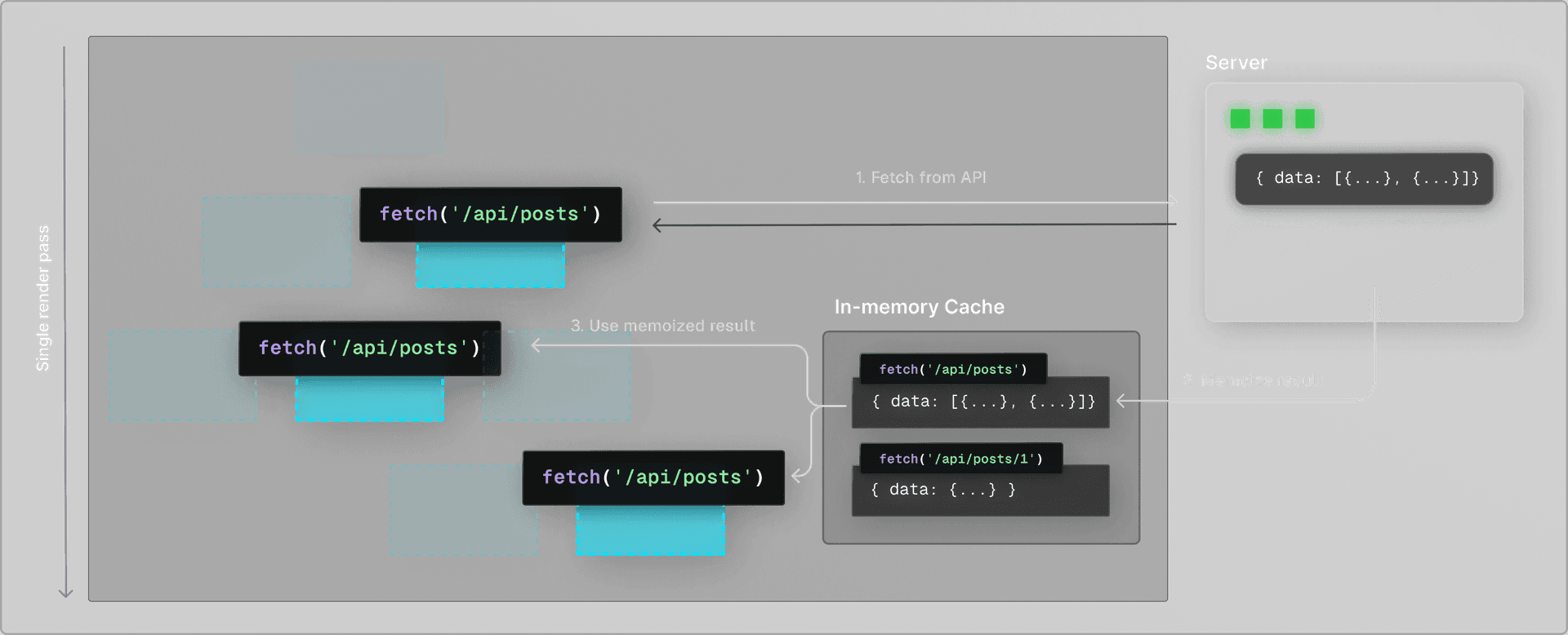 fetchPost(1)fetchPost(1) // Called within same render pass: returns memoized result.These features are helpful when working with React Server components, as they cannot access the Context API. The automatic caching behavior of both cache and fetch allows exporting a single function from a global module and reusing it throughout the application.