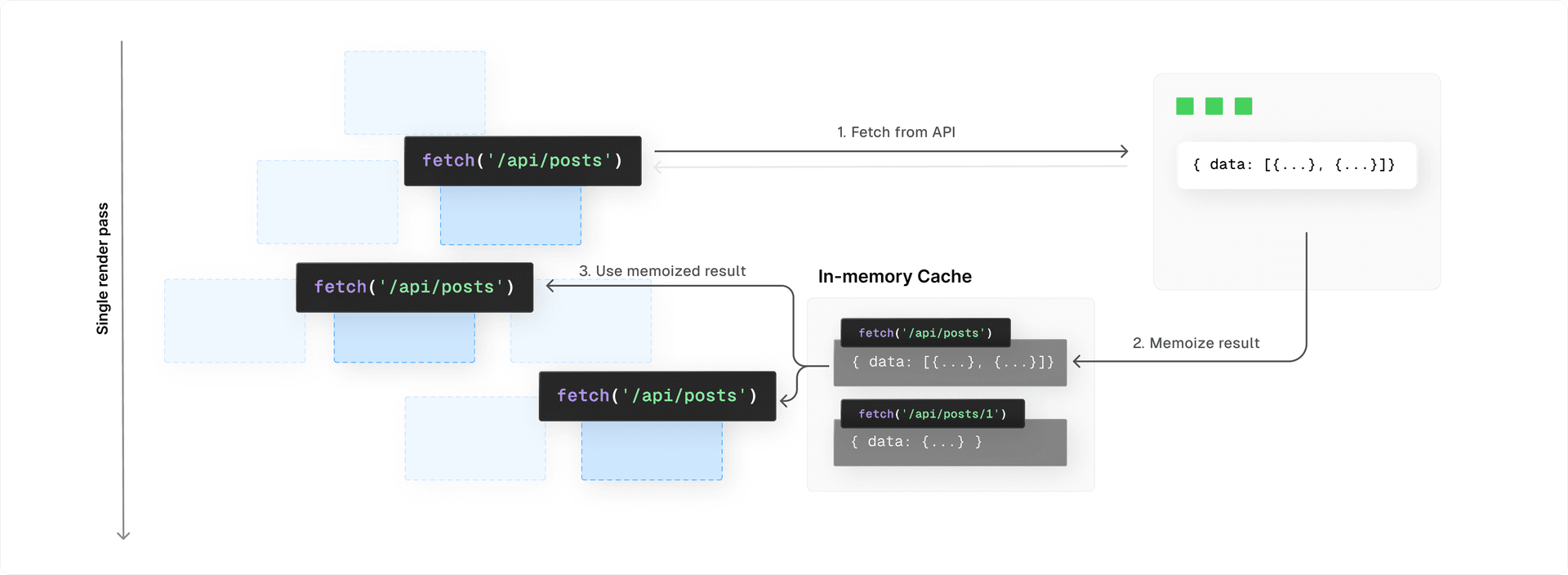 async function BlogPostLayout() { const post = await fetchBlogPost('123'); return '...'}async function BlogPostContent() { const post = await fetchBlogPost('123'); // Returns memoized value return '...'}