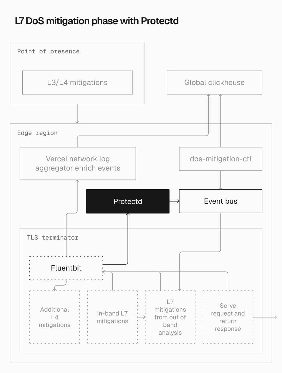 This original system reliably filtered high volumes of traffic and successfully mitigated a wide range of DoS attacks, but faced limitations. For out-of-bound mitigations, time to mitigation (TTM) often exceeded 20 seconds in our old system. When roughly 85% of all L7 protections depend on this pipeline, each passing second carries consequences. Vercel's infrastructure easily absorbs L7 floods, but prolonged attacks risk overwhelming customer backends and generating unwanted usage.