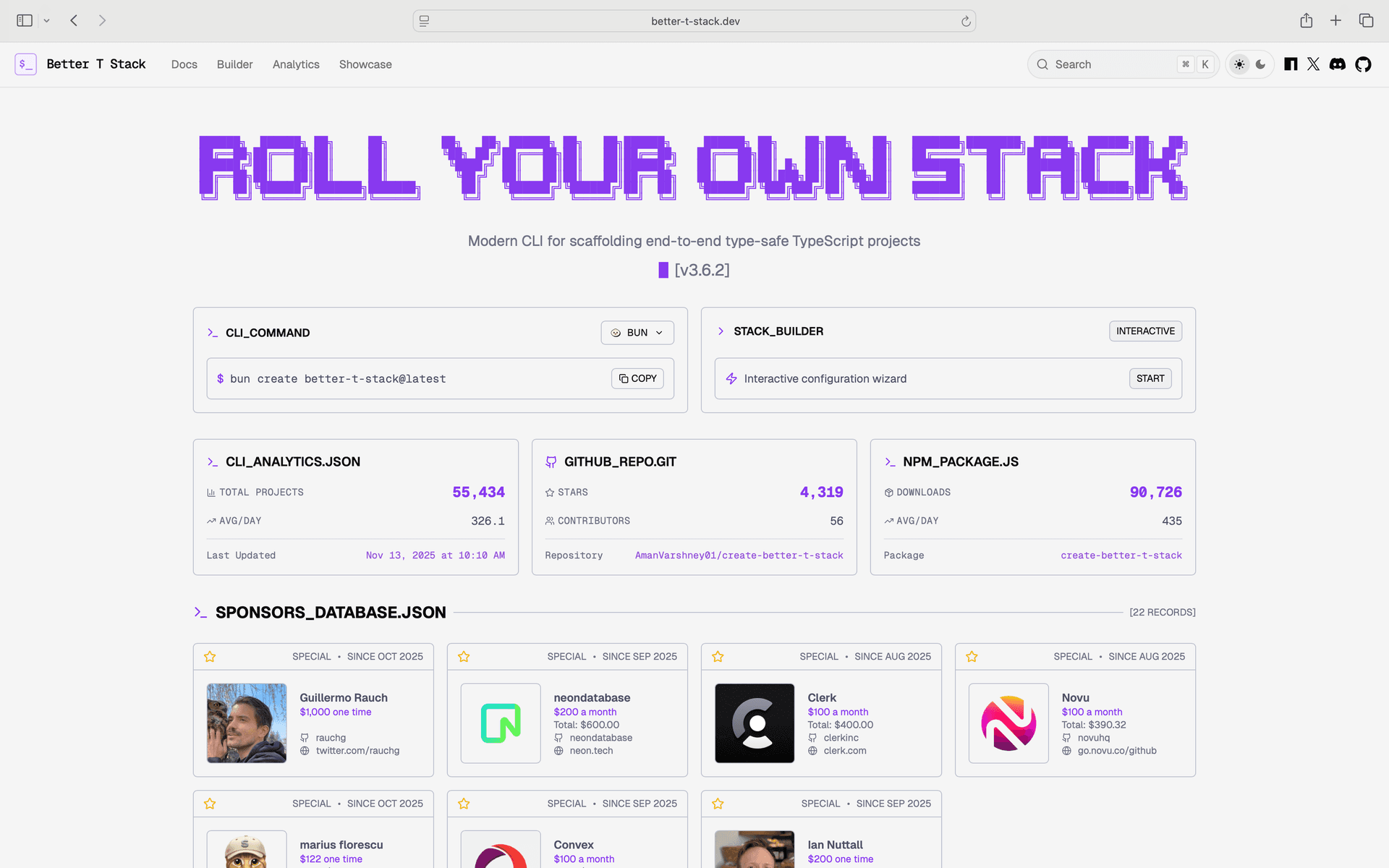 Better T Stack is a modern CLI for scaffolding fully type-safe TypeScript projects, supporting multiple frameworks and databases so developers can mix and match their entire stack in one flexible tool. It’s earned strong community love with 3.8K GitHub stars, 60K+ npm downloads, 40K+ created projects, and sponsorship from companies like Convex, Neon, Better Stack, Clerk, and more.