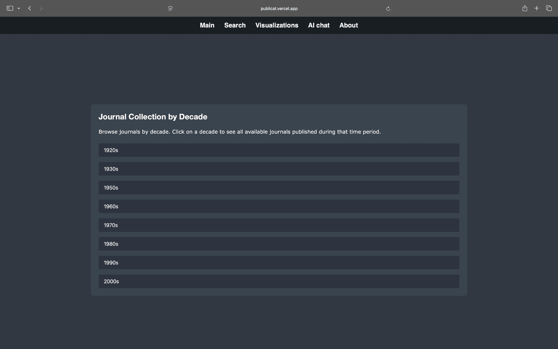 Publicat is a plug-and-play open-source tool that turns any CSV bibliography into an interactive journal explorer with timelines and visualizations, built specifically for humanities researchers without web-development resources. Featured in Stanford’s Open Source Project Registry and used by research groups across multiple countries, it brings accessible, humanities-focused digital tools to scholars who traditionally lack the technical or institutional support to publish their datasets online.