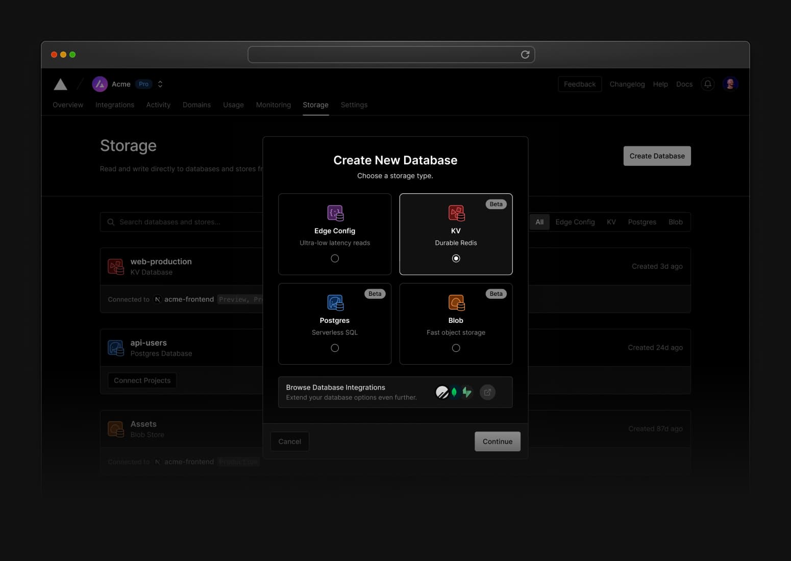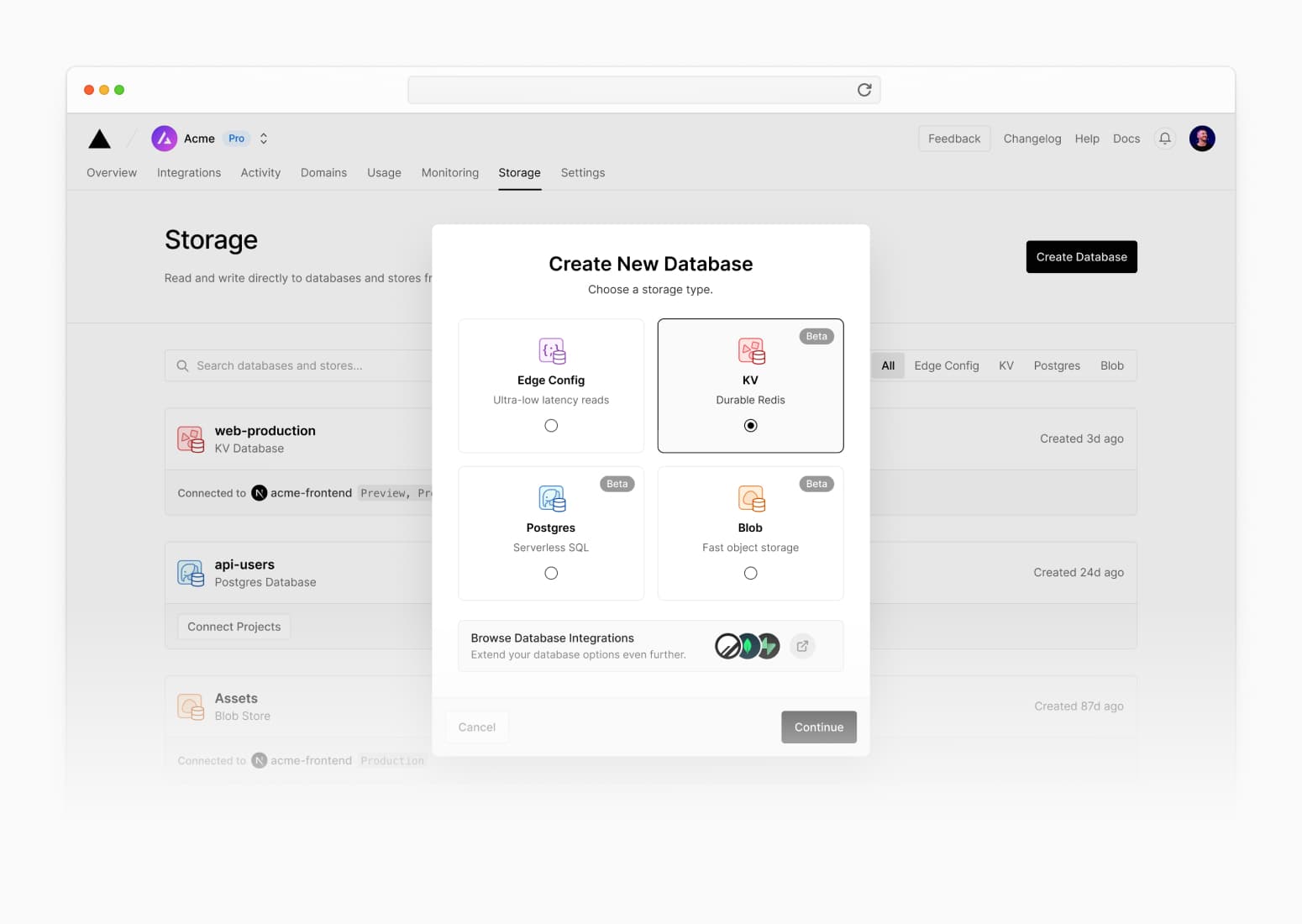 Today, we’re excited to announce a suite of serverless storage solutions now available on Vercel, powered by some of the best infrastructure providers in the industry.