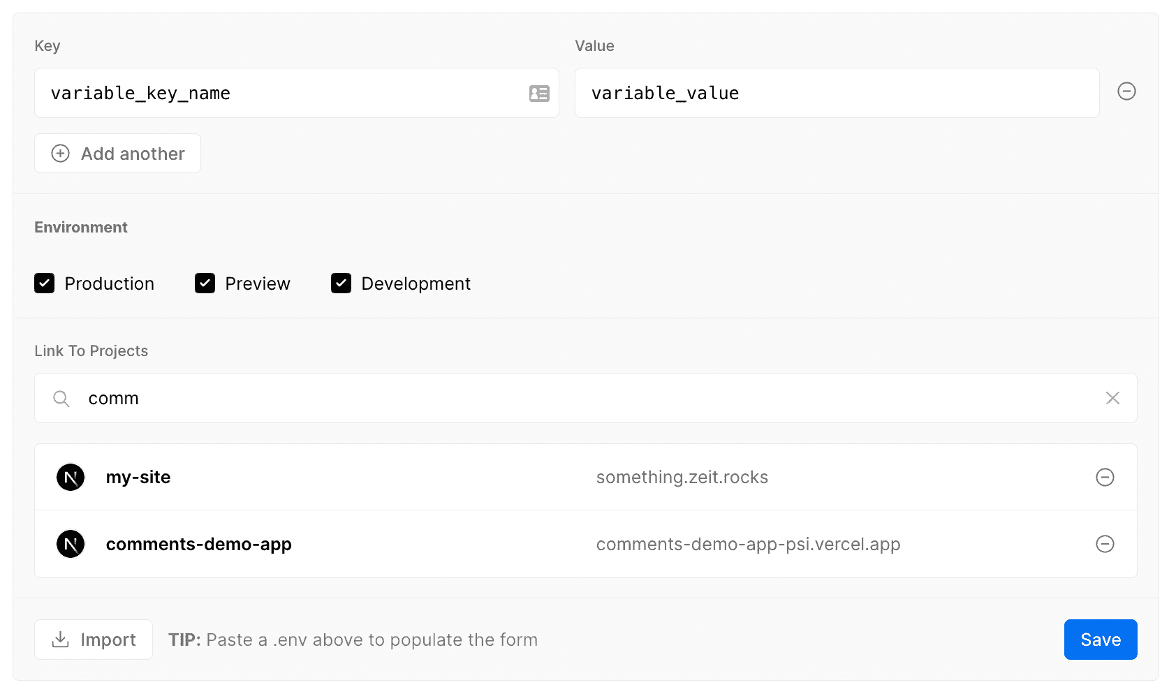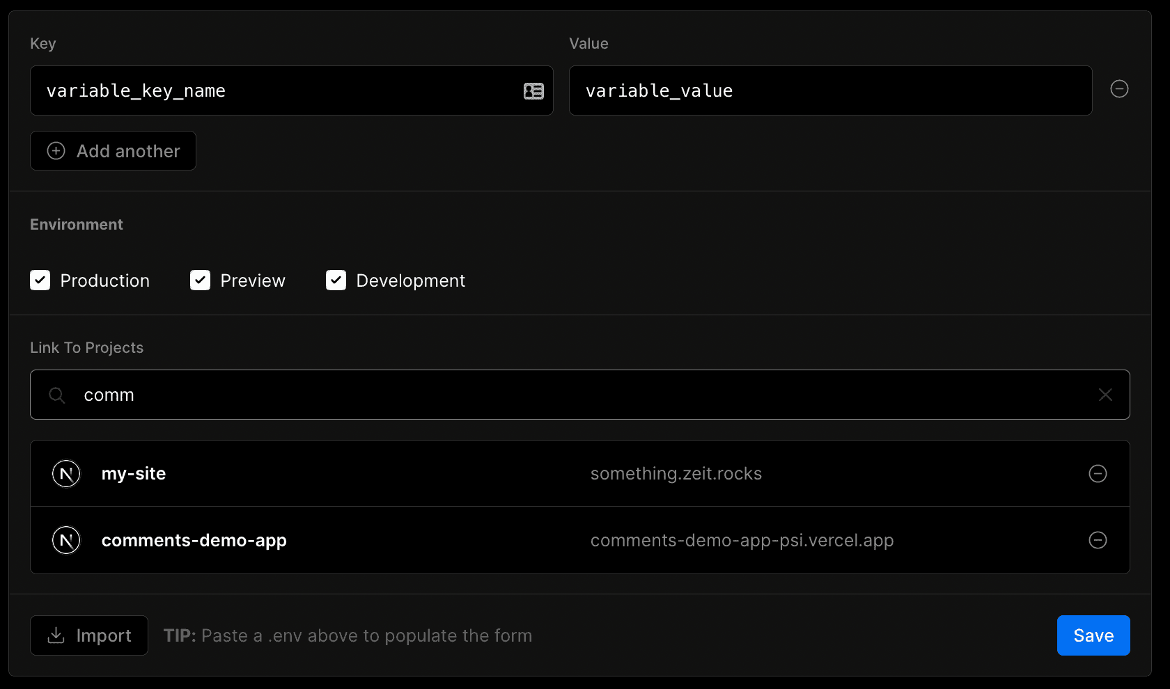 - Populate the form with your environment variable details or paste or import an file:
