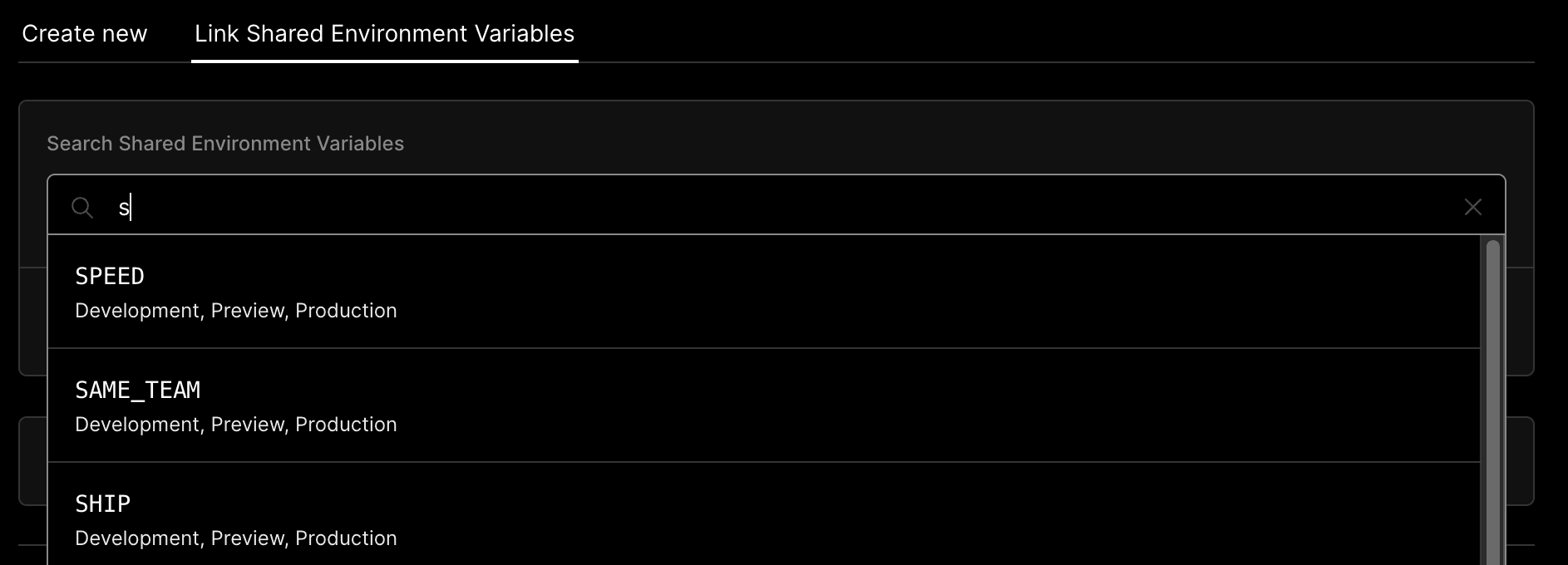 - Select one or more Shared Environment Variables using the search box:
