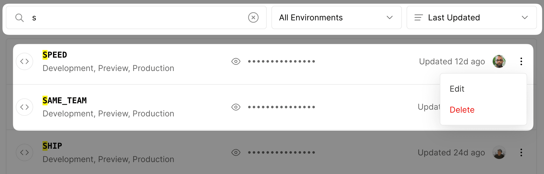 - Use the context menu on the specific Shared Environment Variable by clicking the vertical ellipsis icon on the right side of the row