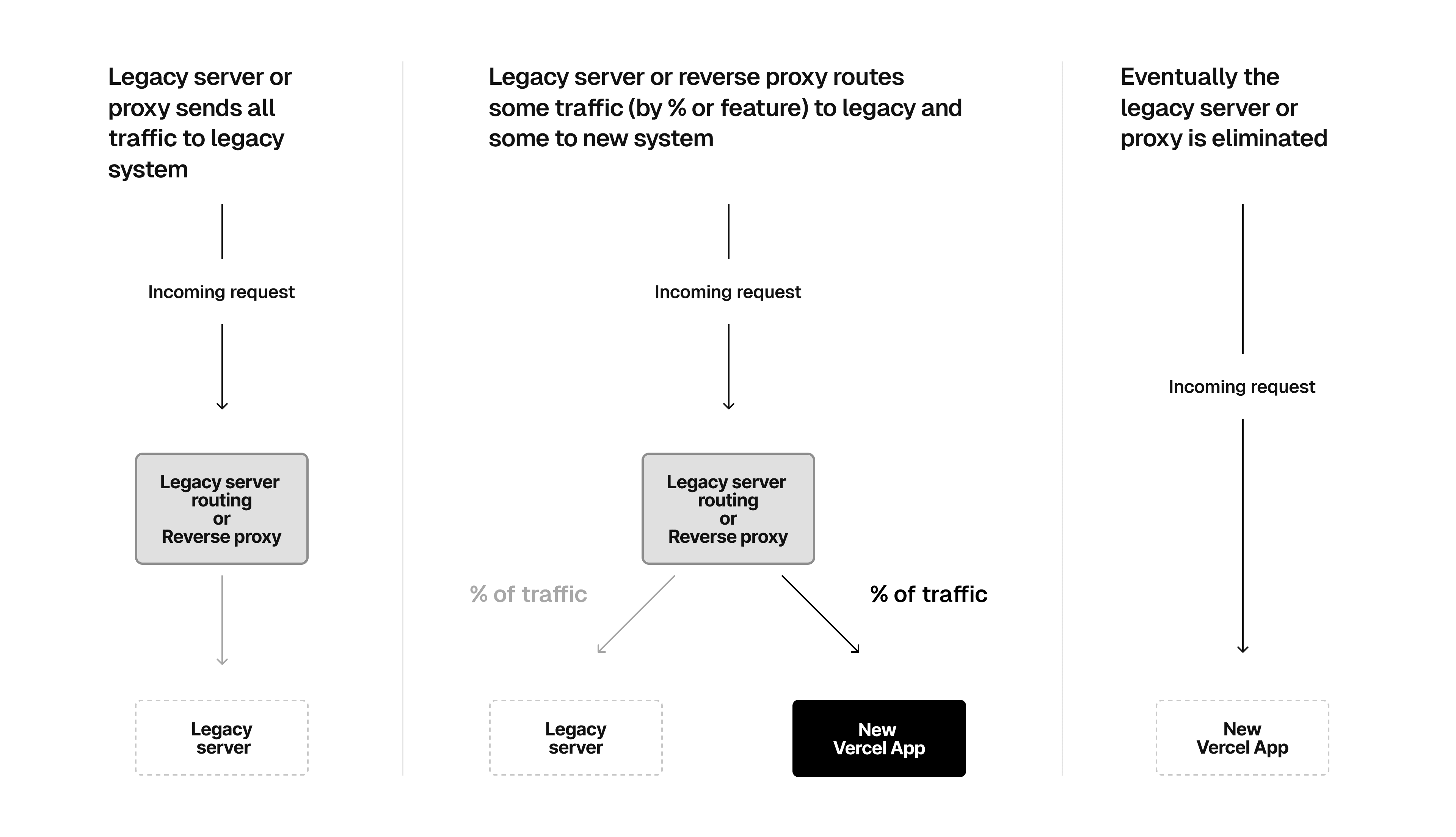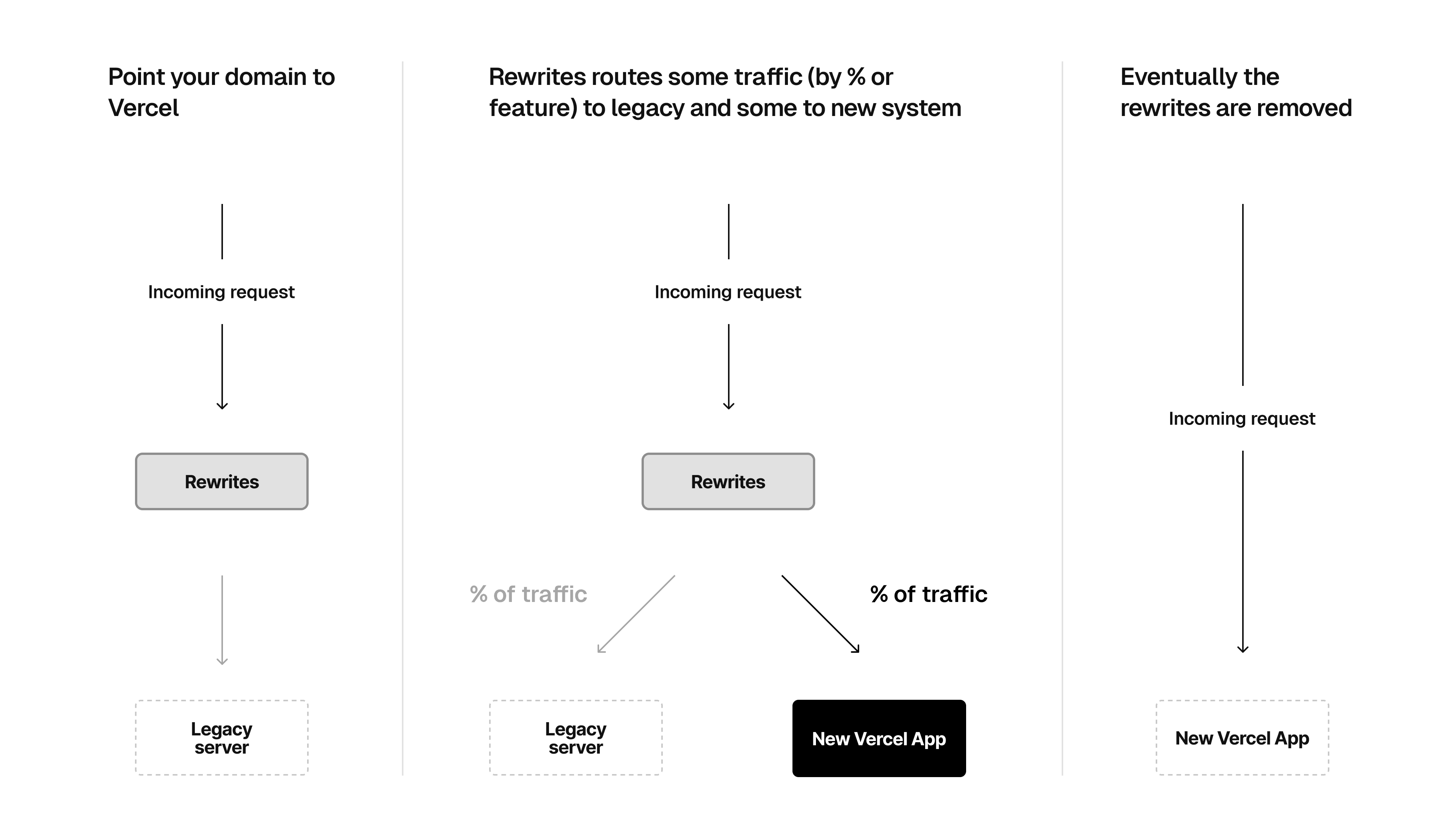 In this approach, you make Vercel the entry point for all your production traffic. When you begin, all traffic will be sent to the legacy server with rewrites and/or fallbacks. As you migrate different aspects of your site to Vercel, you can remove the rewrites/fallbacks to the migrated paths so that they are now served by Vercel.