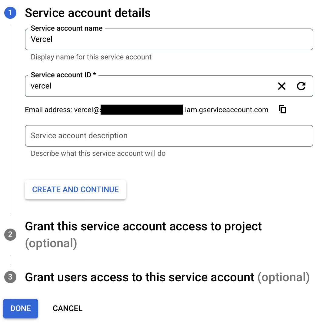 Value Location Environment Variable Example Project ID IAM & Admin -> Settings Project Number IAM & Admin -> Settings Service Account Email IAM & Admin -> Service Accounts Workload Identity Pool ID IAM & Admin -> Workload Identity Federation -> Pools Workload Identity Pool Provider ID IAM & Admin -> Workload Identity Federation -> Pools -> Providers Then, declare them as environment variables in your Vercel project.