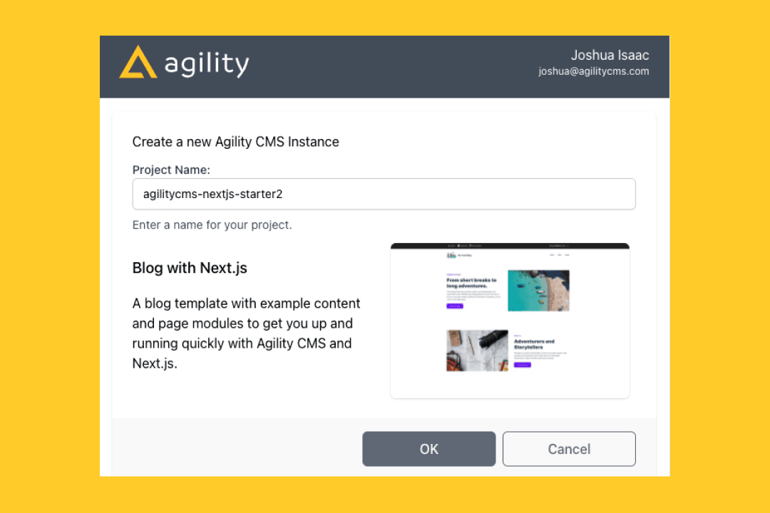 You will be asked to Login or Sign Up to Agility CMS. After authenticating with Agility CMS, create or select the Agility CMS Instance you'd like to connect your project to.