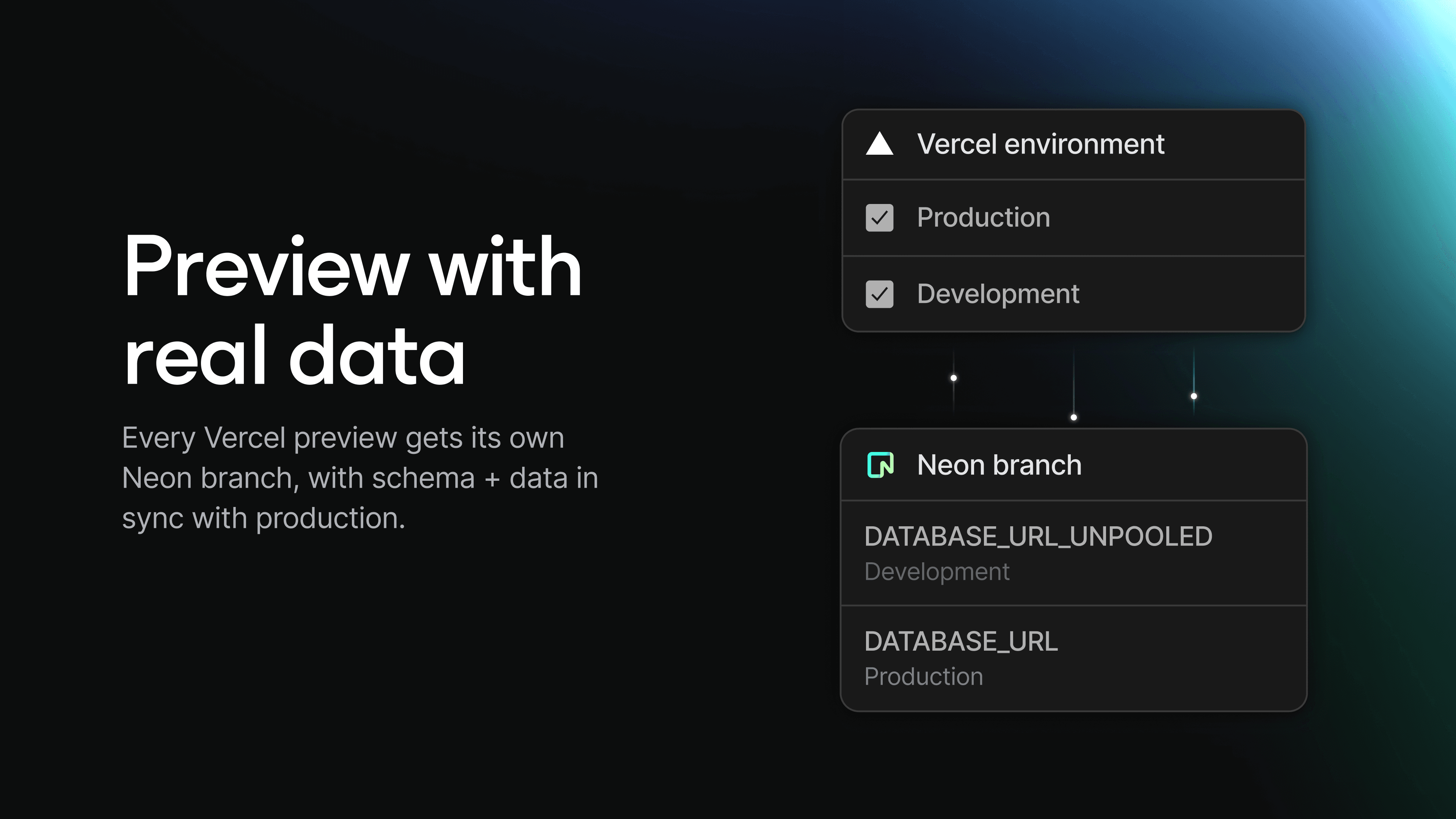 Link Existing Neon Account: Installs the Neon Postgres Previews Integration. Connects your Vercel project to your Neon database to create a database branch for each preview deployment. See the Install the Neon Previews Integration for more information.