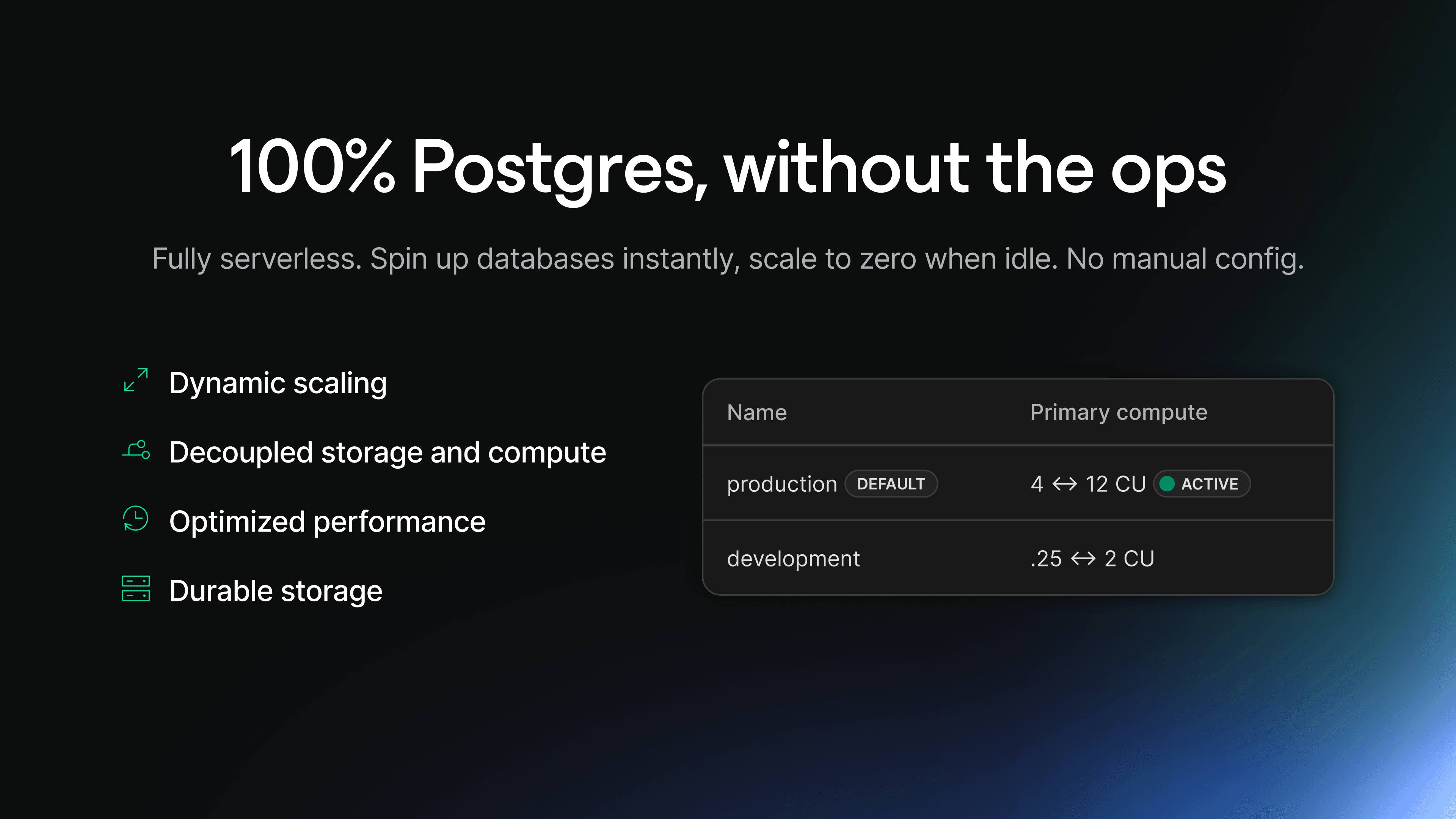 Neon takes everything developers love about Postgres — reliability, performance, extensibility — and delivers it as a serverless product that helps you ship reliable, scalable applications faster than ever.