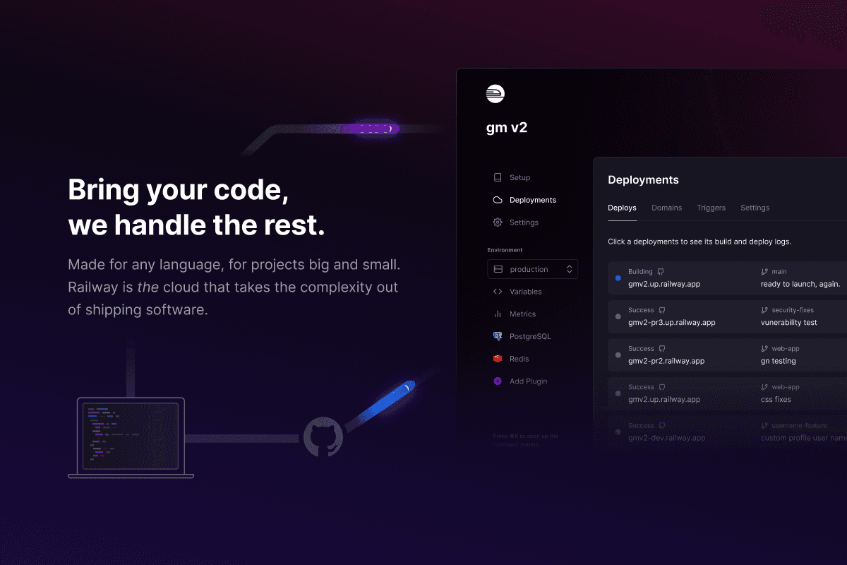Railway is an infrastructure platform where you can provision infrastructure, develop with that infrastructure locally, and then deploy to the cloud. This integration allows you to seamlessly connect your Postgres, Redis, MySQL, or Mongo databases hosted on Railway to your Vercel production and preview deployments.