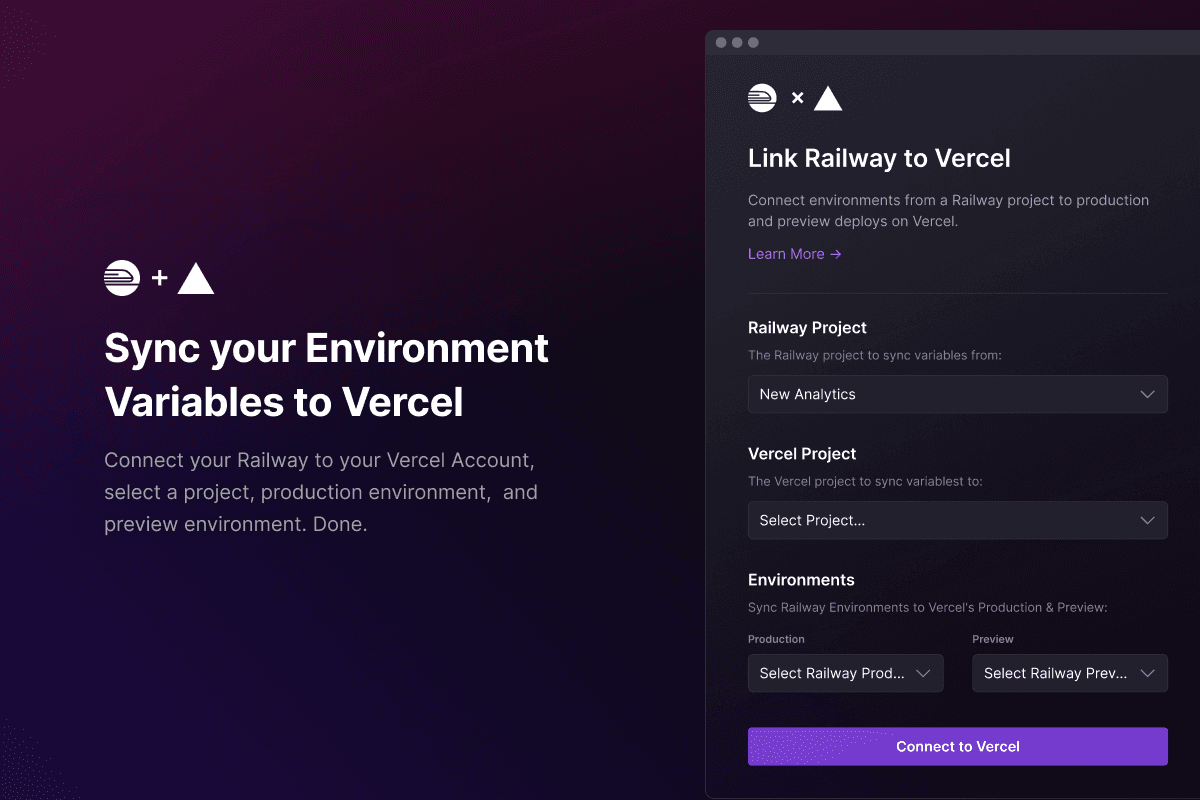This integration will provide your Vercel production and preview deploys with access to your Railway project variables. You can configure which Railway environment will be connected to each Vercel environment individual.